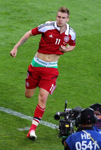 L’attaccante danese Nicklas Bendtner e’ stato squalificato dalla Uefa e multato di 100.000 euro per aver mostrato i propri slip firmati da un bookmaker durante il goal del match contro il Portogallo. Siccome la Danimarca è stata eliminata nella fase a gironi, il giocatore, quindi, e’ destinato a scontare la squalifica nella prima gara di qualificazione per i Mondiali 2014.