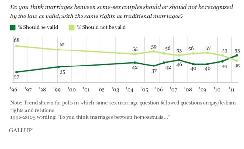 Un sondaggio Gallup realizzato venerdì scorso ha rilevato come la maggioranza della popolazione americana supporti il matrimonio gay. Infatti, il 53% è d’accordo sul concedere il diritto agli omosessuali e il 45%, invece, si dice contrario. Il risultato è epocale: è stato il primo promosso dal gruppo che in quindici anni ha visto gli oppositori alle nozze in minoranza. Evan Wolfson, Presidente di Freedom to Marry, ha rilasciato la seguente dichiarazione: