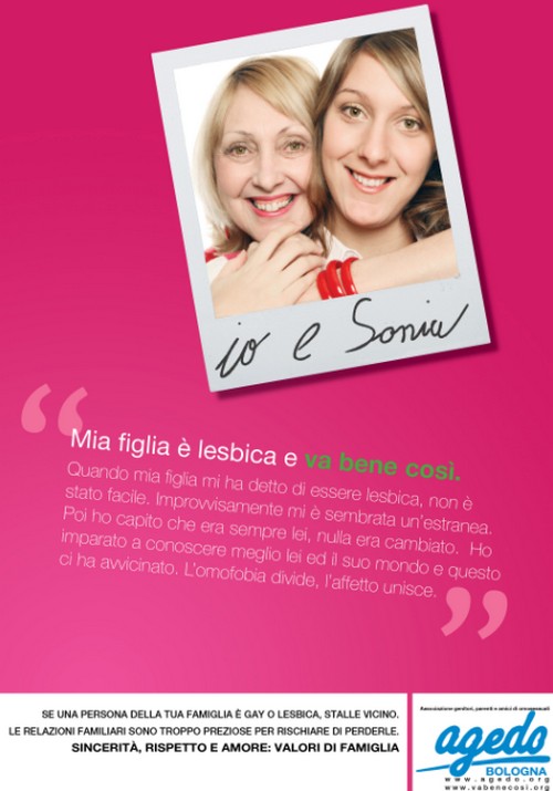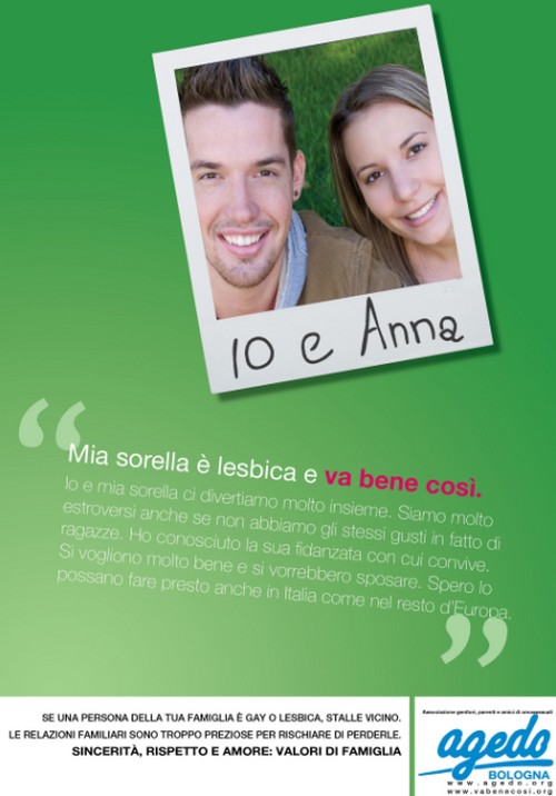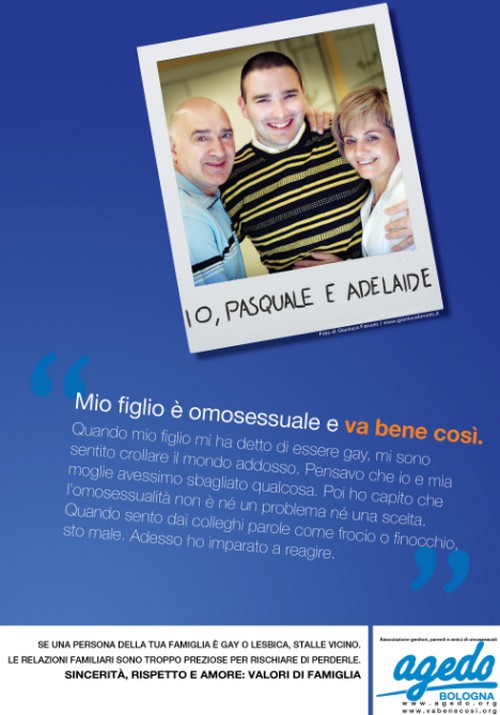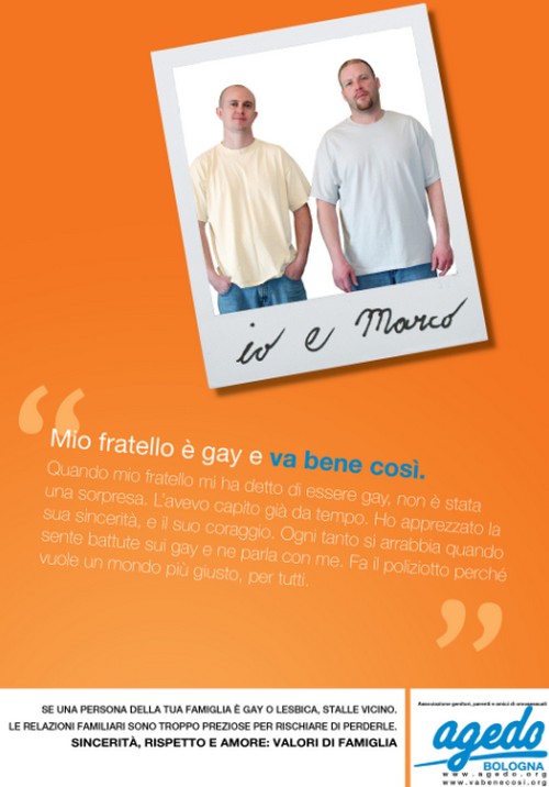 Porta per titolo, E va bene così, la campagna sociale di Arcigay Aosta, nata dalla collaborazione con Agedo, associazione di genitori di omosessuali, e grazie al patrocinio del comune di Aosta e del Csv. I manifesti della campagna saranno affissi nel capoluogo con un messaggio di fondo molto significativo: se si scopre di avere un figlio, un fratello, un parente gay non bisogna isolarlo, ma accoglierlo nel migliore dei modi possibili.