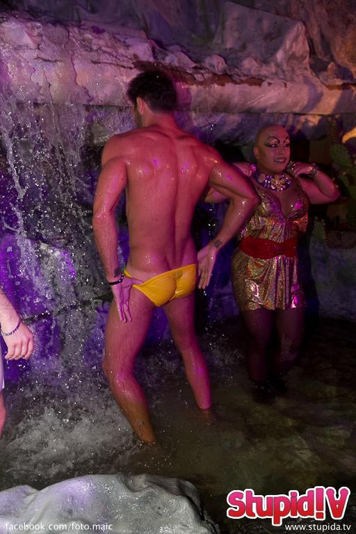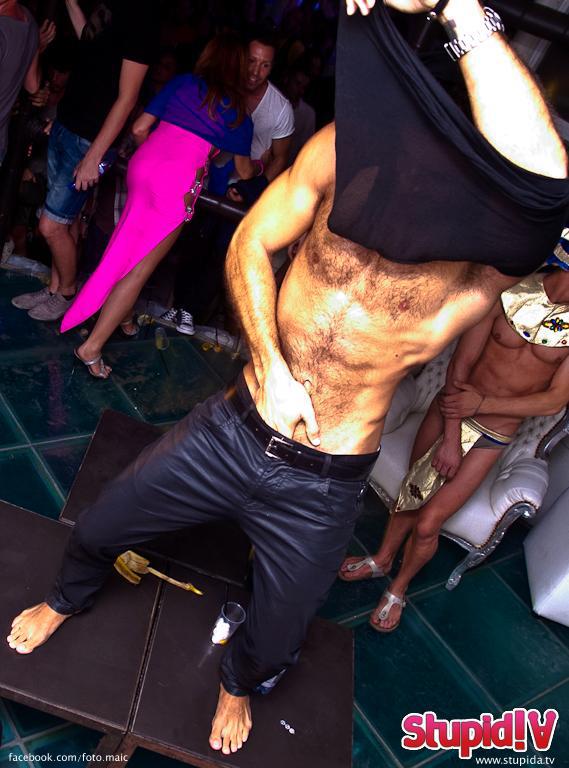 Valerio ha prima improvvisato uno streap tease su un cubo, poi si è tuffato nella piscina (con annessa cascata) insieme agli animatori della serata. Non pago di ciò si è fatto togliere il costume restando completamente nudo.